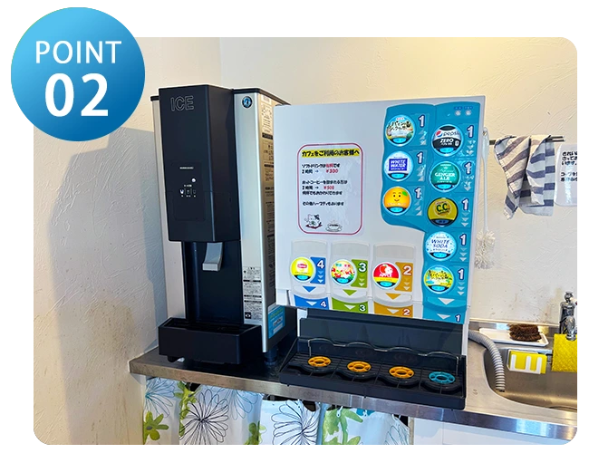 24 時間フリーのソフトドリンクといつでもコーヒーをセルフドリップできます。