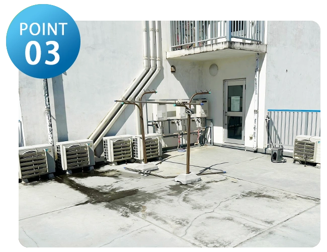 3階のベランダに海のレジャーに必須の水道、物干し、大きな桶をご用意。